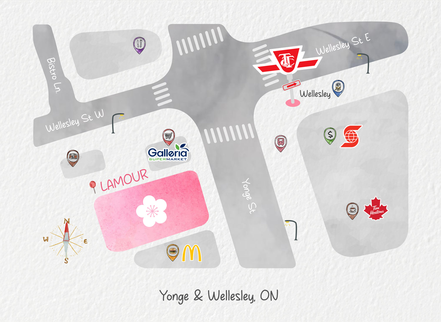 Lamour across from Wellesley subway station, next to McDonald's and Galleria Supermarket.