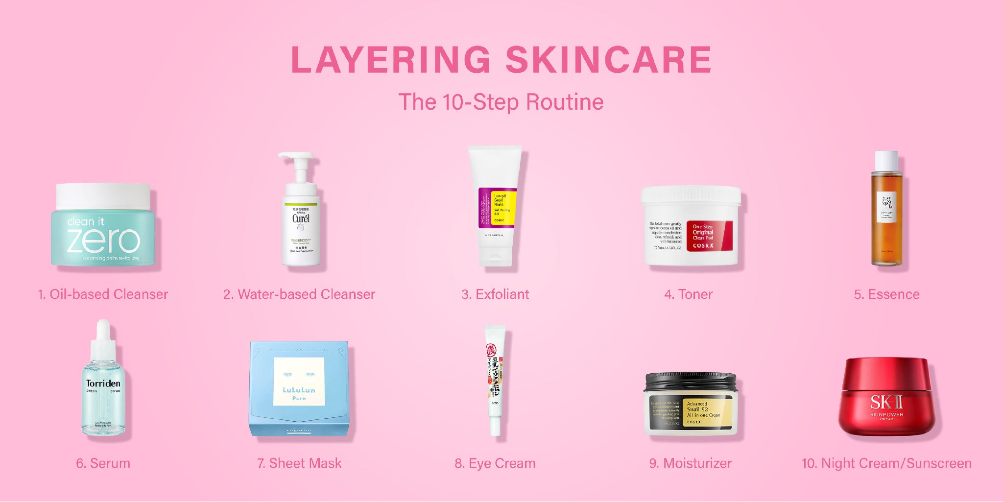 Although it may be hard to follow, many Korean women faithfully follow an 8 to 10-step skincare routine every day to maintain the beauty of their skin. The multiple-step method provides a clever approach to maximize your skin's ability to absorb the products by gradually layering them. This technique allows the skin to thoroughly soak up each thin layer, maximizing its hydrating benefits. Key Korean skincare steps generally include oil cleansers, water-based cleansers, exfoliants, toners, essence, serum, sheet mask, eye cream, moisturizers, night creams or sunscreens. Each product plays a specific and equally important role.