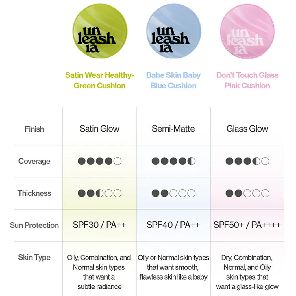 Unleashia Babe Skin Baby Blue Cushion 具有高遮瑕度和轻盈的半哑光效果。其收缩毛孔、保湿配方可使肌肤光滑亮丽——TikTok 的无瑕妆容首选!